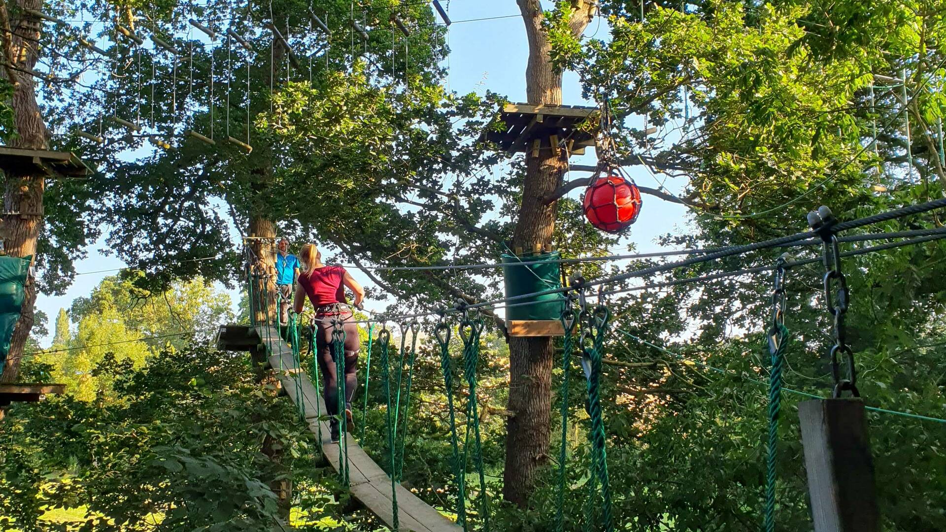 Nous escaladons le tout premier arbre. Nous sommes à 5 mètres de hauteur. Les premiers ateliers sont accessibles : pont de singe suspendu, filet, rondin de bois… nous évoluons à notre rythme et nous prenons confiance petit à petit. Les cliquetis des mousquetons résonnent dans le calme de la nature. Il fait bon, le soleil de fin de journée nous offre sa lumière dorée. Après avoir admiré la vue depuis les plateformes, c’est le moment de la première tyrolienne ! Sans doute mon atelier favori. La raison ? Une sensation de légèreté et de puissance à la fois. Accrochés à la poulie, nous sommes prêts pour le décollage ! La plus longue tyrolienne du parc mesure 351 mètres de longueur, l’occasion parfaite pour admirer la canopée.
