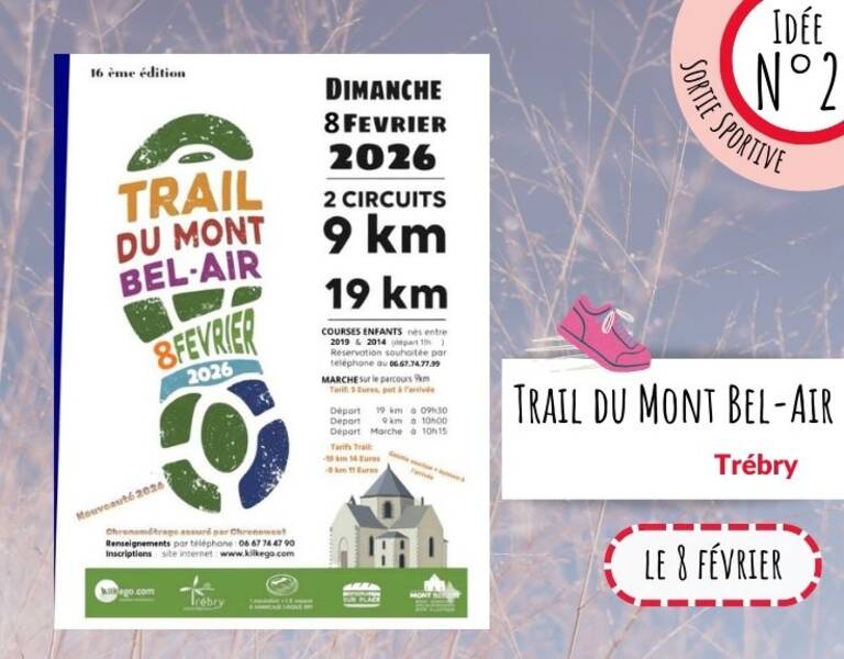 Pour cette 16e édition du Trail du Mont Bel-Air, un parcours de 9km et un parcours de 19km vous attendent, alternant chemins creux, sous-bois et passages de rivière. Un circuit de marche ainsi qu'une course pour enfant sont prévus pour une journée sous le signe du sport ouverte à tous !